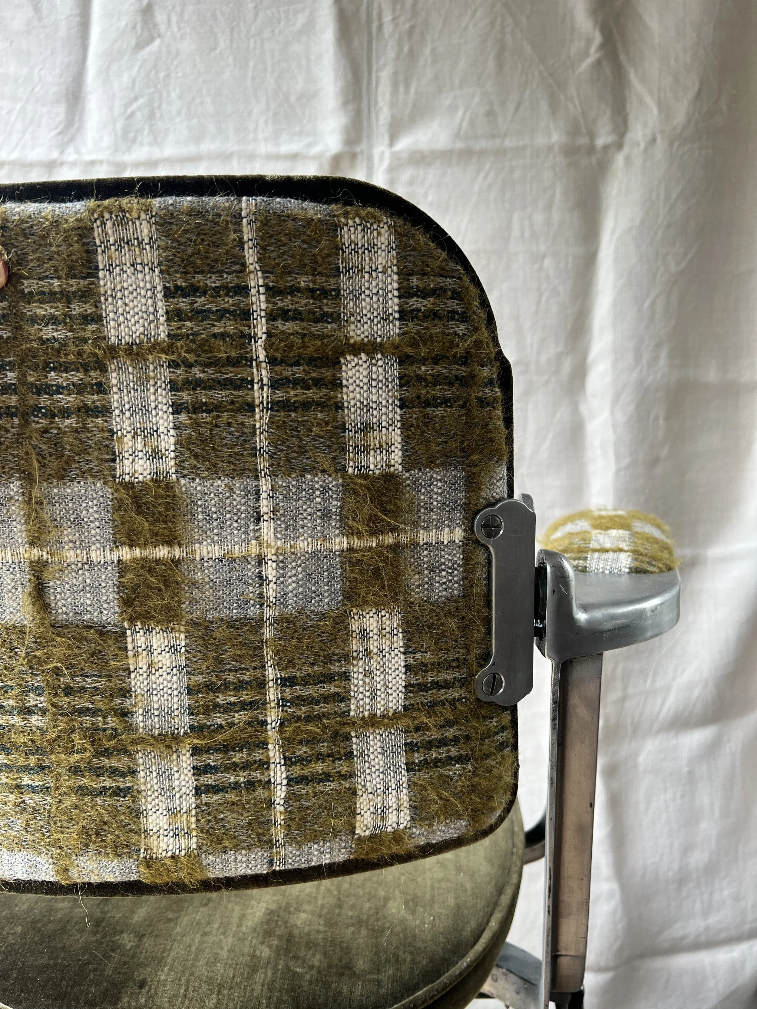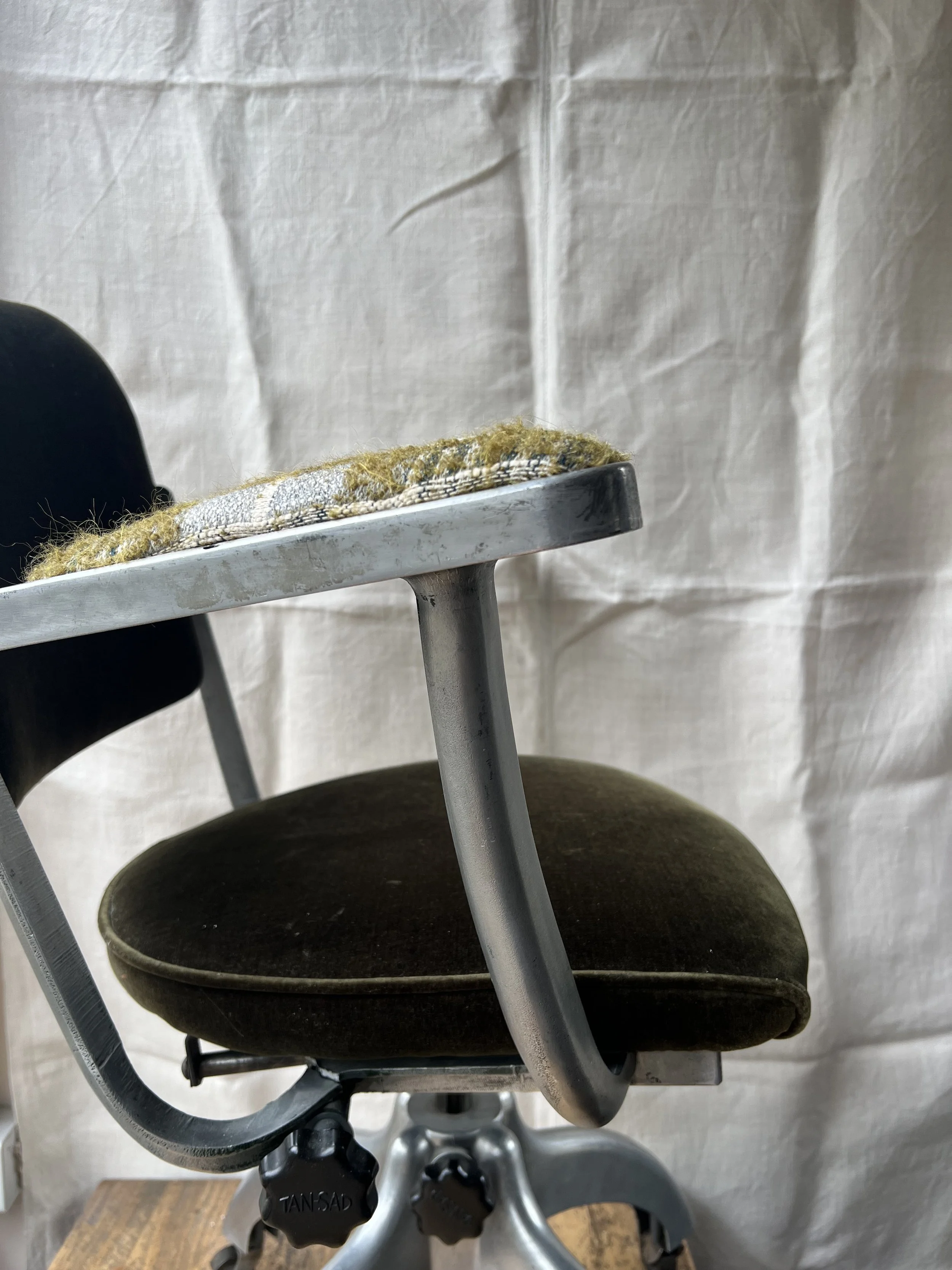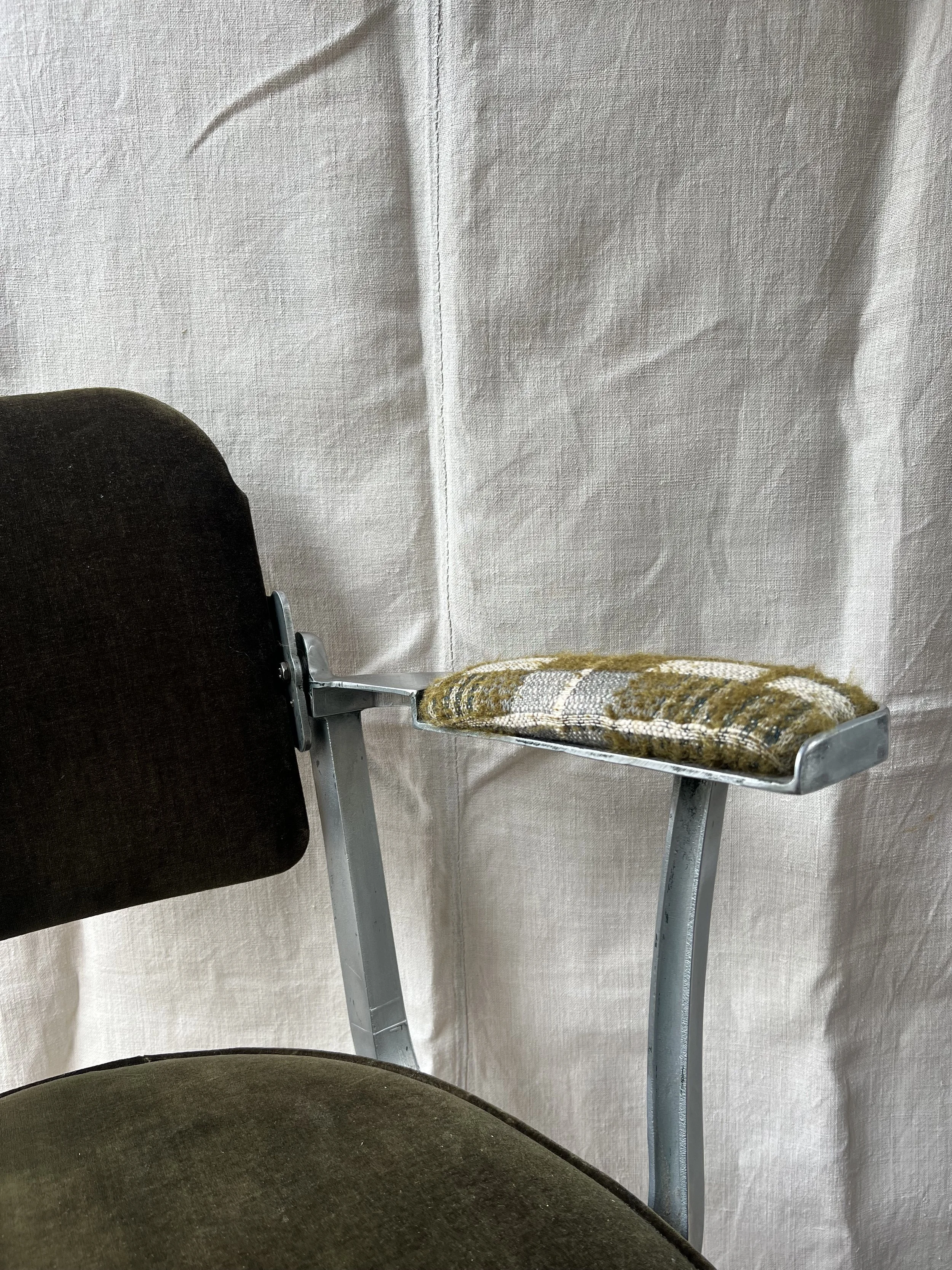 A vintage industrial metal desk chair with new upholstery and original castors. We are selling this at a low price as there is a split in one of the metal arms - see last pic. The chair is still usable.