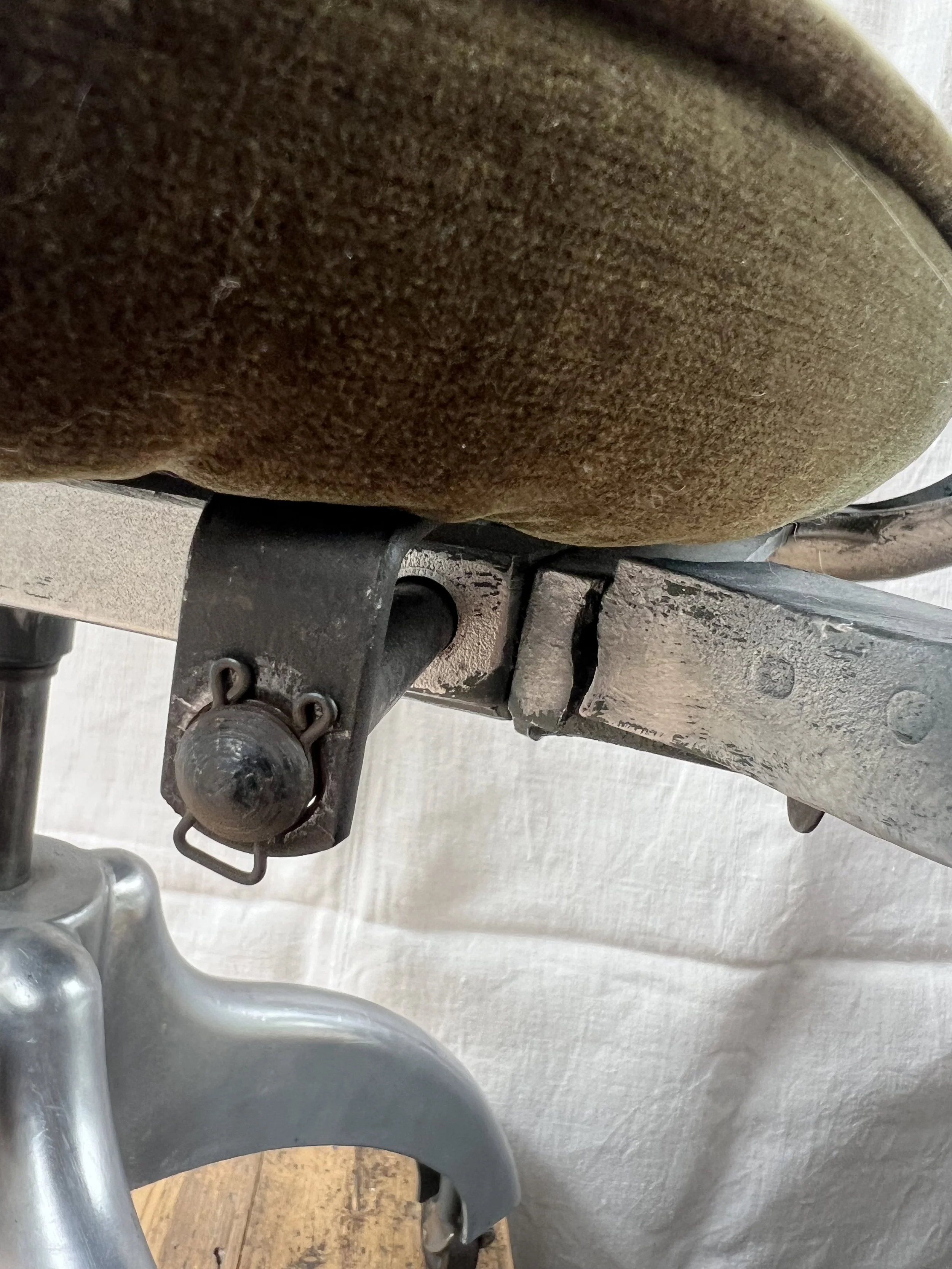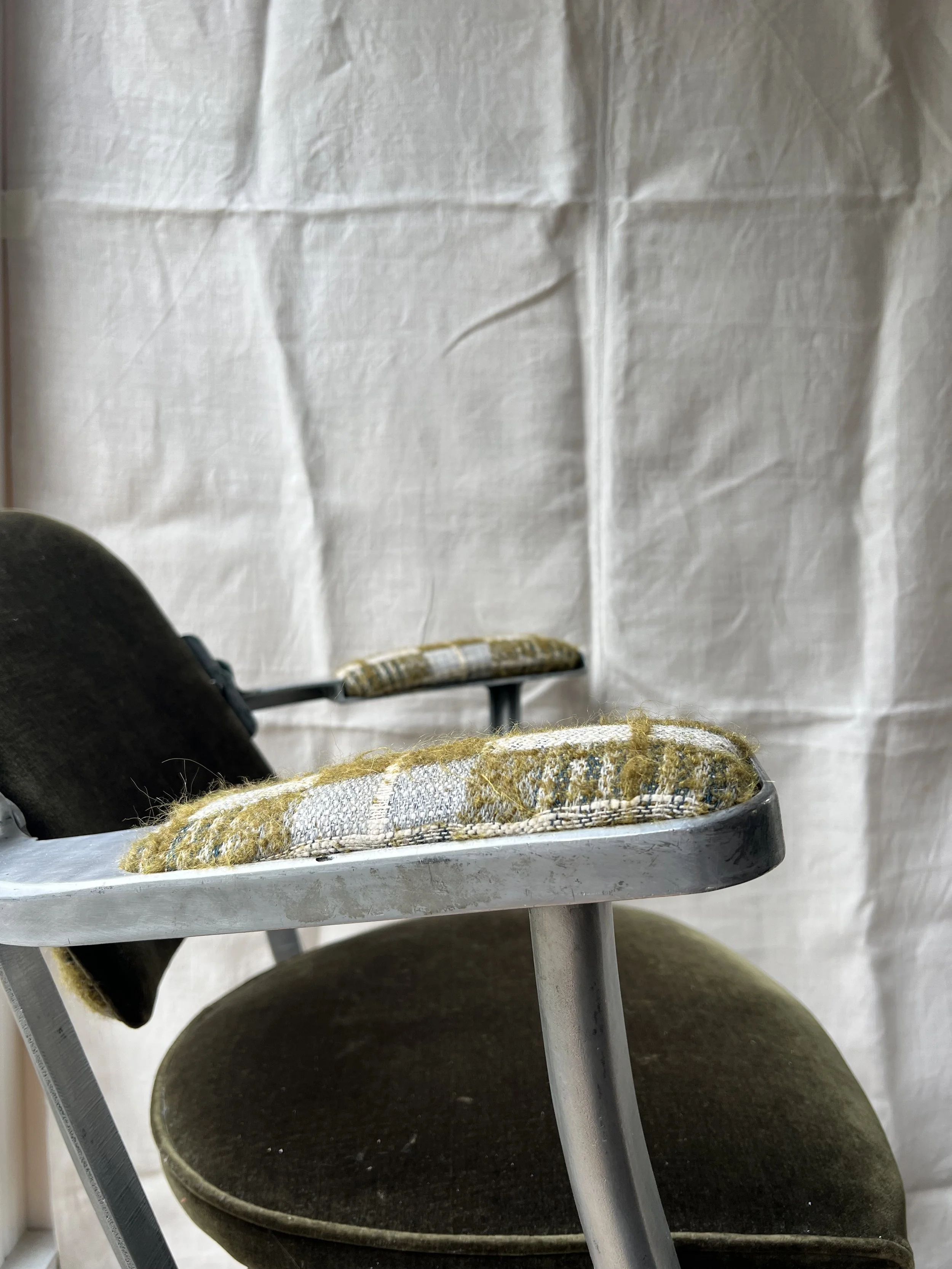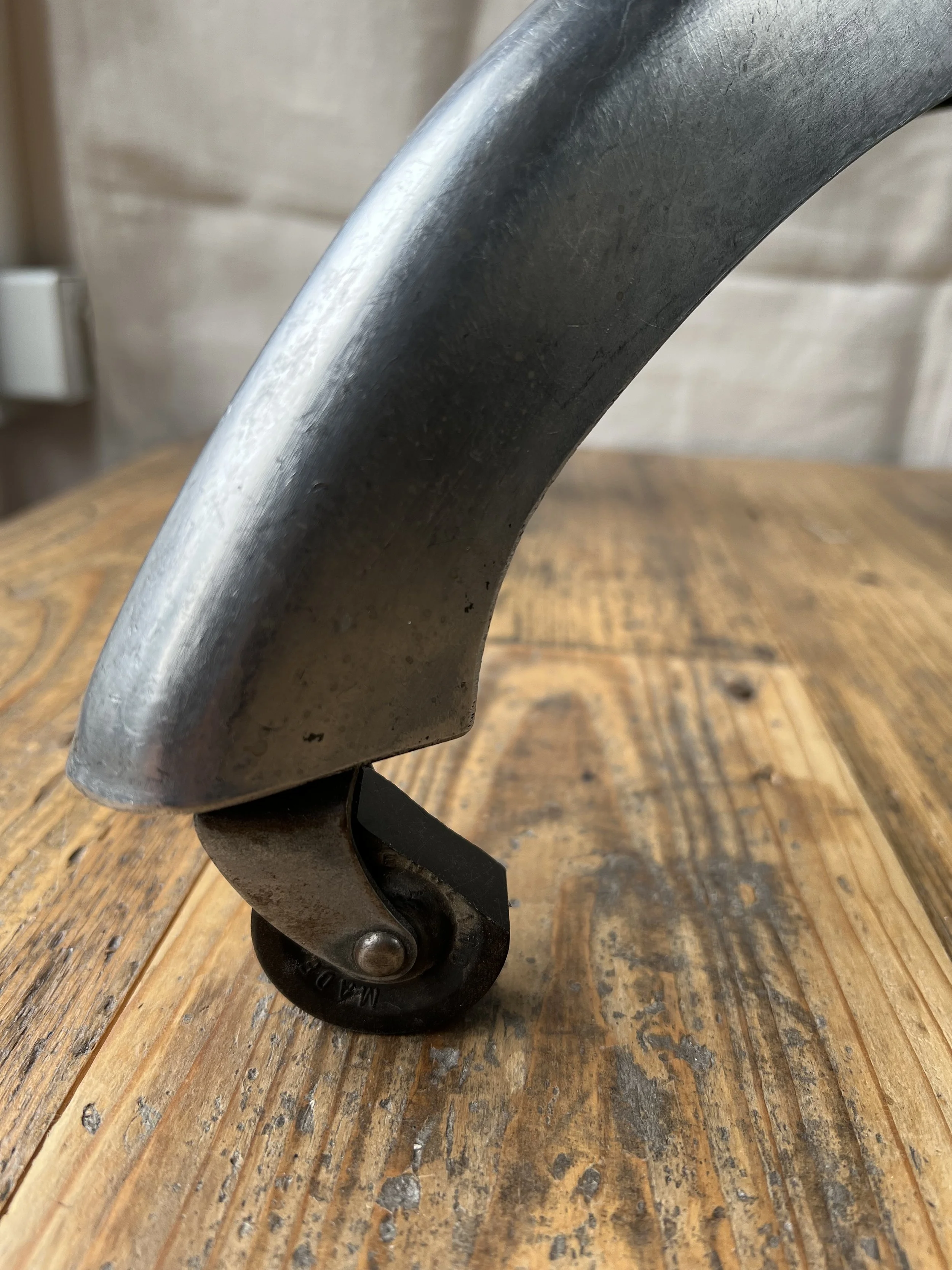 A vintage industrial metal desk chair with new upholstery and original castors. We are selling this at a low price as there is a split in one of the metal arms - see last pic. The chair is still usable.